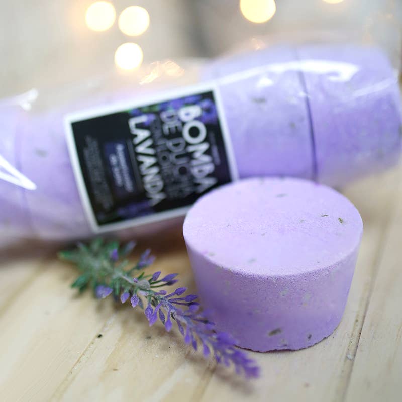 Duschbomben mit Lavendelblüten, verkauft in 5er-Packs. Jede Einheit ist einzeln eingeschweißt, um die Eigenschaften zu bewahren und zu schützen.