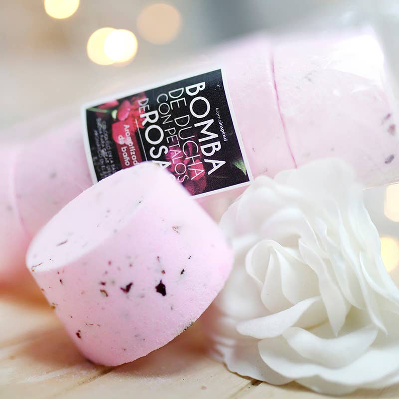 Duschbomben mit Rosenblättern. Diese werden in Verpackungseinheiten zu je 5 Stück verkauft, wobei jede einzelne in Schrumpffolie eingeschweißt ist, um ihre Eigenschaften zu bewahren und zu schützen.